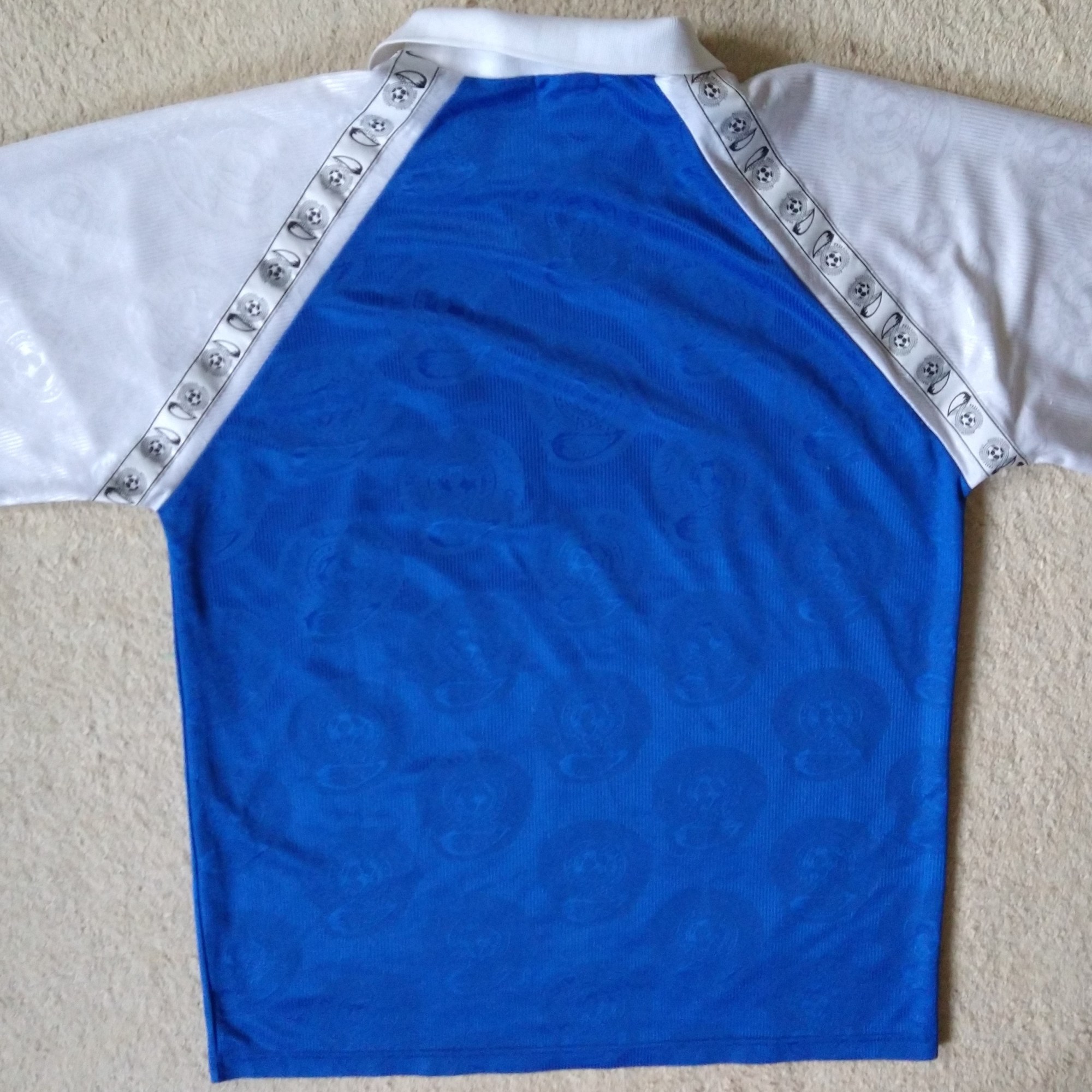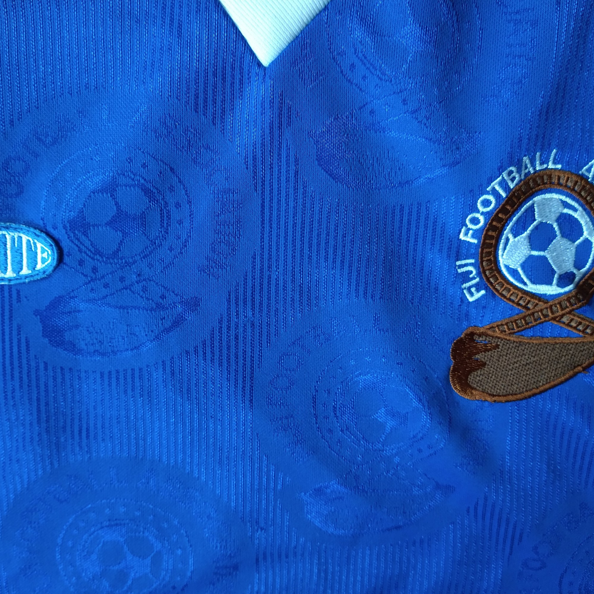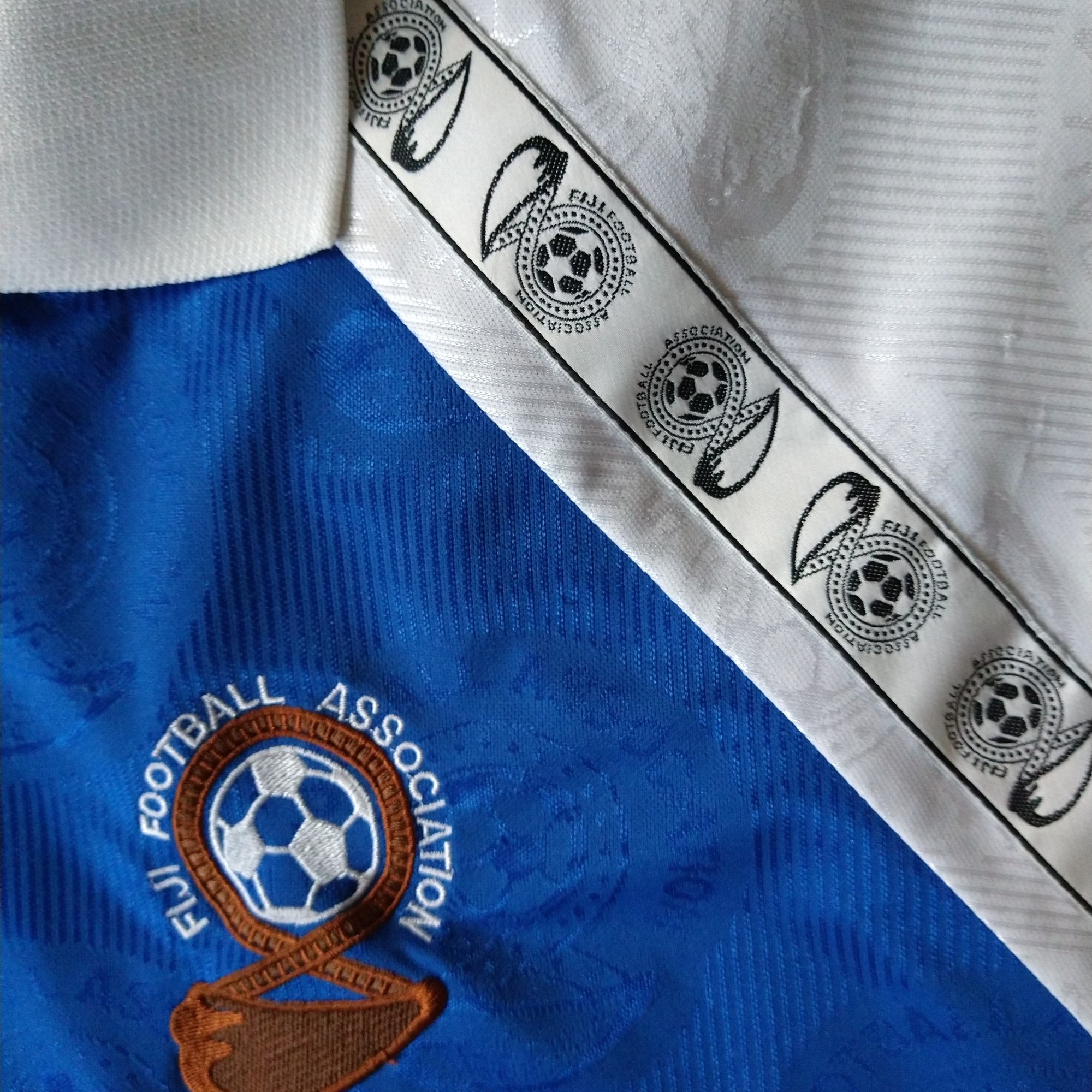 Am I absolutely sure this is a Fiji shirt? Fiji Football Association name and logo printed into the fabric across the whole shirt, embroidered onto the front and all across the stripes at the start of the sleeves. White really wanted you to know it was a Fiji shirt. Additionally, unlike a lot of Fiji shirts which are a full plain colour, we have the lovely traditional deep blue of the away contrasted nicely by the white sleeves. This shirt really works. OFC nations tend to have one or two spectacular shirts across their history and this is very much Fiji’s.